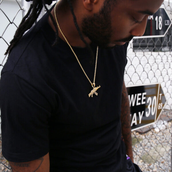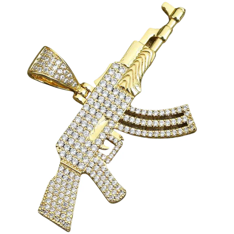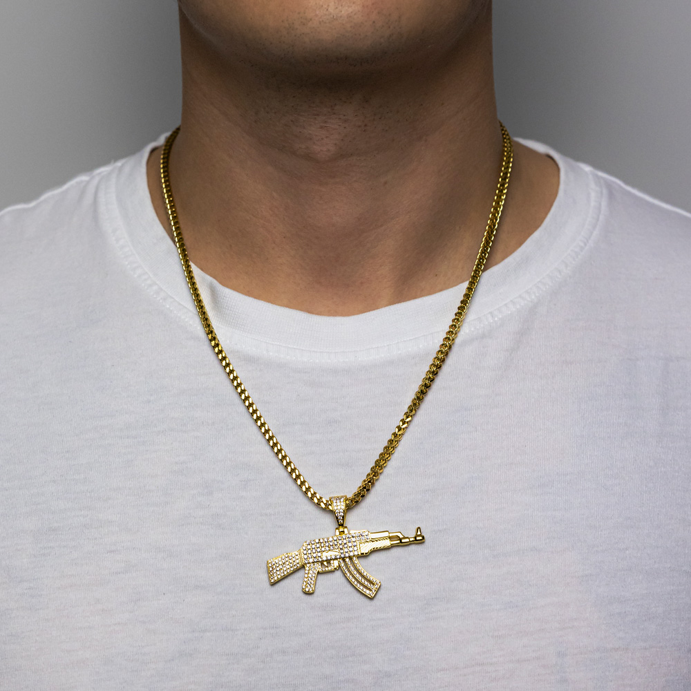 Erleben Sie die kraftvolle Ausstrahlung des AK-47 Pendant – Goldbeschichtung von ICE Switzerland.